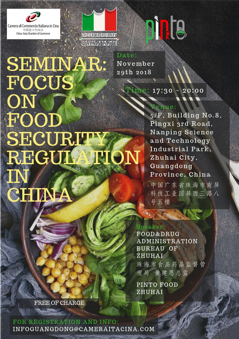The China-Italy Chamber of Commerce is glad to invite you to the upcoming Seminar “Focus on food security regulation in China" on November 29th in Zhuhai.