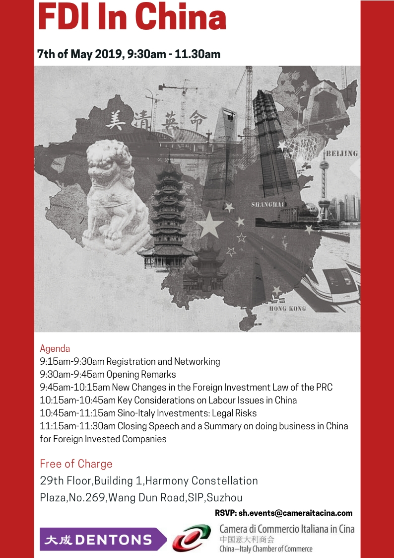 The China-Italy Chamber of Commerce (CICC) is glad to invite you to the seminar "FDI in China" which is being organized by Dentons on the 7th of May 2019 and will be held at the 29th Floor, Building 1, Harmony Constellation Plaza No.269 Wang Dun Road, SIP, Suzhou.