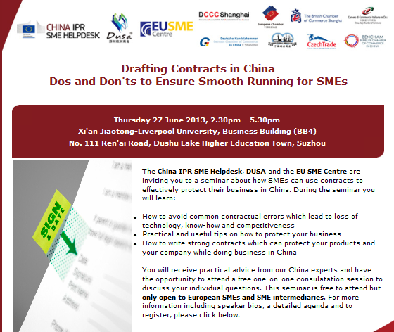 2.30pm - 3.00pm: Registration and networking; 3.00pm - 3.10pm: Welcome and introduction to the topic by Tom Meyer, Board member, DUSA; 3.10pm - 3.20pm: Introduction to the EU SME Centre; 3.20pm - 3.50pm: Using Contracts to Protect your Business in China(Ludmila Hyklova, Legal Expert, EU SME Centre); 3.50pm - 4.00pm: Introduction to the China IPR SME Helpdesk (Judith van de Bovenkamp, Project Officer, China IPR SME Helpdesk); 4.00pm - 4.30pm: How to use contracts to protect your intellectual property (Maarten Roos, Managing Director, R&P China Lawyers); 4.30pm - 5.00pm: Q&A Session; 5.00pm - 5.30pm: One-on-one Consultation Sessions (optional)