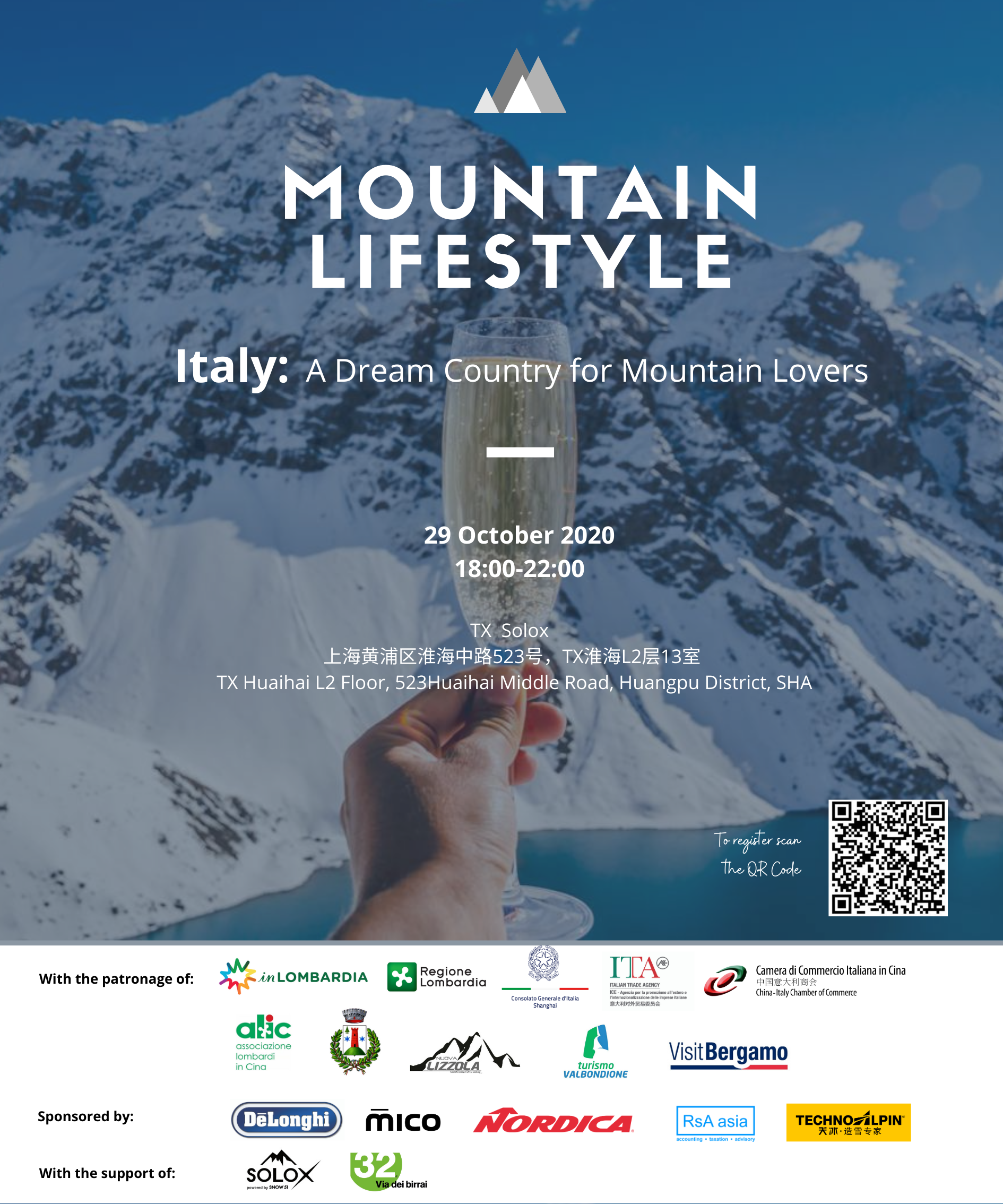 The Sport and Tourism Working Group of the China-Italy Chamber of Commerce together with the main sponsors Delonghi, Mico, Nordica, RsA Asia and Technoalpin would like to invite you to the event: "Mountain Lifestyle, Italy: A Dream Country for Mountain Lovers”, that will be held in Shanghai on October 29th, at Solo X.