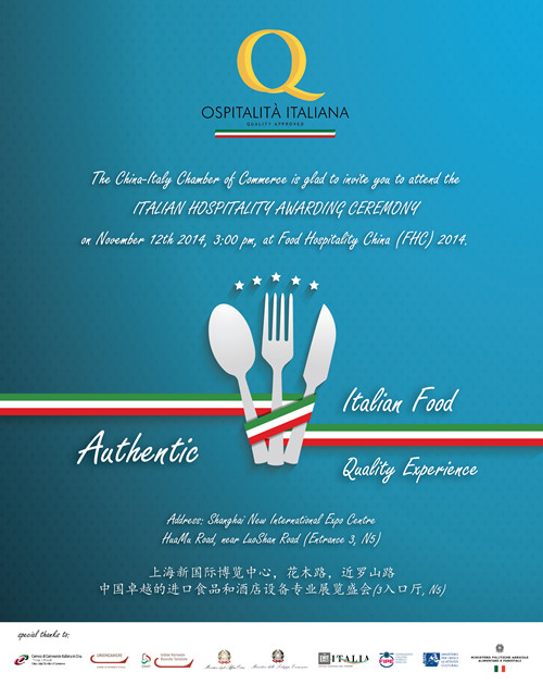 The “Italian Hospitality Seal” is a certification of quality, promoted by Unioncamere with the administrative support of the National Institute for Tourism Research (IS.NA.R.T.), and in collaboration with 5 Ministries (Foreign Affairs, Cultural Heritage, Economic Development, Tourism and Agriculture), given every year to those Italian restaurants in Shanghai, Beijing and Guangzhou that respect the Italian traditional recipes using only “Made in Italy products”. The project is realized thanks to the collaboration of the Italian Chambers of Commerce Abroad (CCIE) and is now at its 4th edition.
