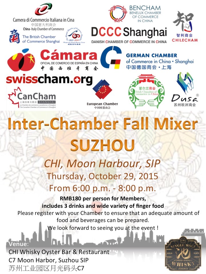 China Italy Chamber of Commerce (CICC) is delighted to invite all of its Members to take part to the Inter-Chamber Fall Mixer in Suzhou. Do not miss the chance to join us for a fun night of networking!