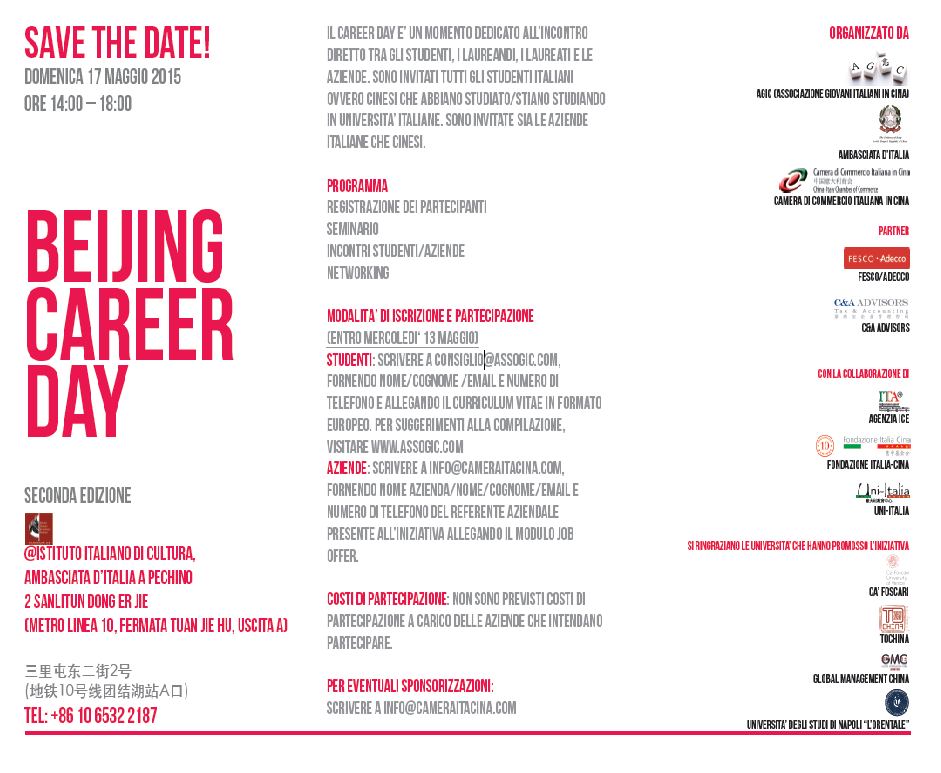 After success of First Edition, China-Italy Chamber of Commerce (CICC), in cooperation with the Embassy of Italy in Beijing and Agic (Association of Young Italians in China) is delighted to invite you to the Career Day - Second Edition on Sunday, May 17th at the Italian Institute of Culture (Embassy of Italy in Beijing).