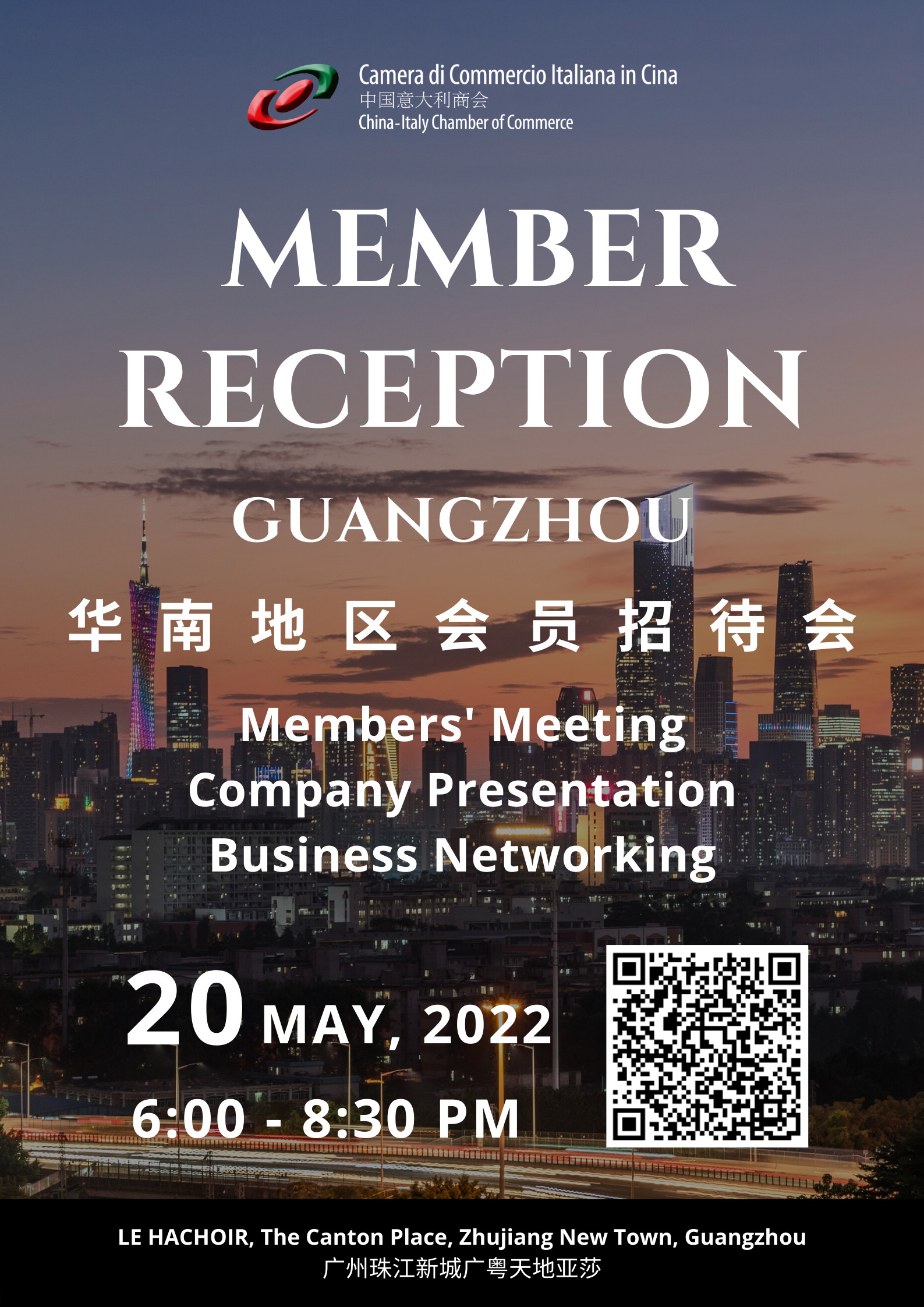 The China-Italy Chamber of Commerce (CICC) is cordially inviting you to the event "Member Reception - Guangzhou" to be held on Friday, May 20th, 2022 from 6:00 to 8:30 PM at LE HACHOIR 亚莎 in Guangzhou.