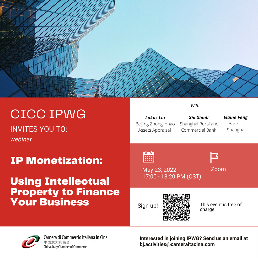 The China-Italy Chamber of Commerce (CICC) with its Intellectual Property Working Group (IPWG) invites you to join our online roundtable “IP Monetization: Using Intellectual Property to Finance Your Business”, on May 23rd at 5:00 pm (Beijing time).