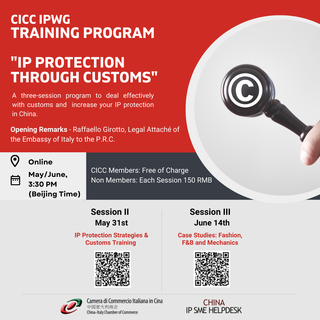 The China-Italy Chamber of Commerce (CICC) is glad to invite you to join the second session of the Training Program “IP Protection through Customs” on May 31st from 3:30 pm (Beijing Time).