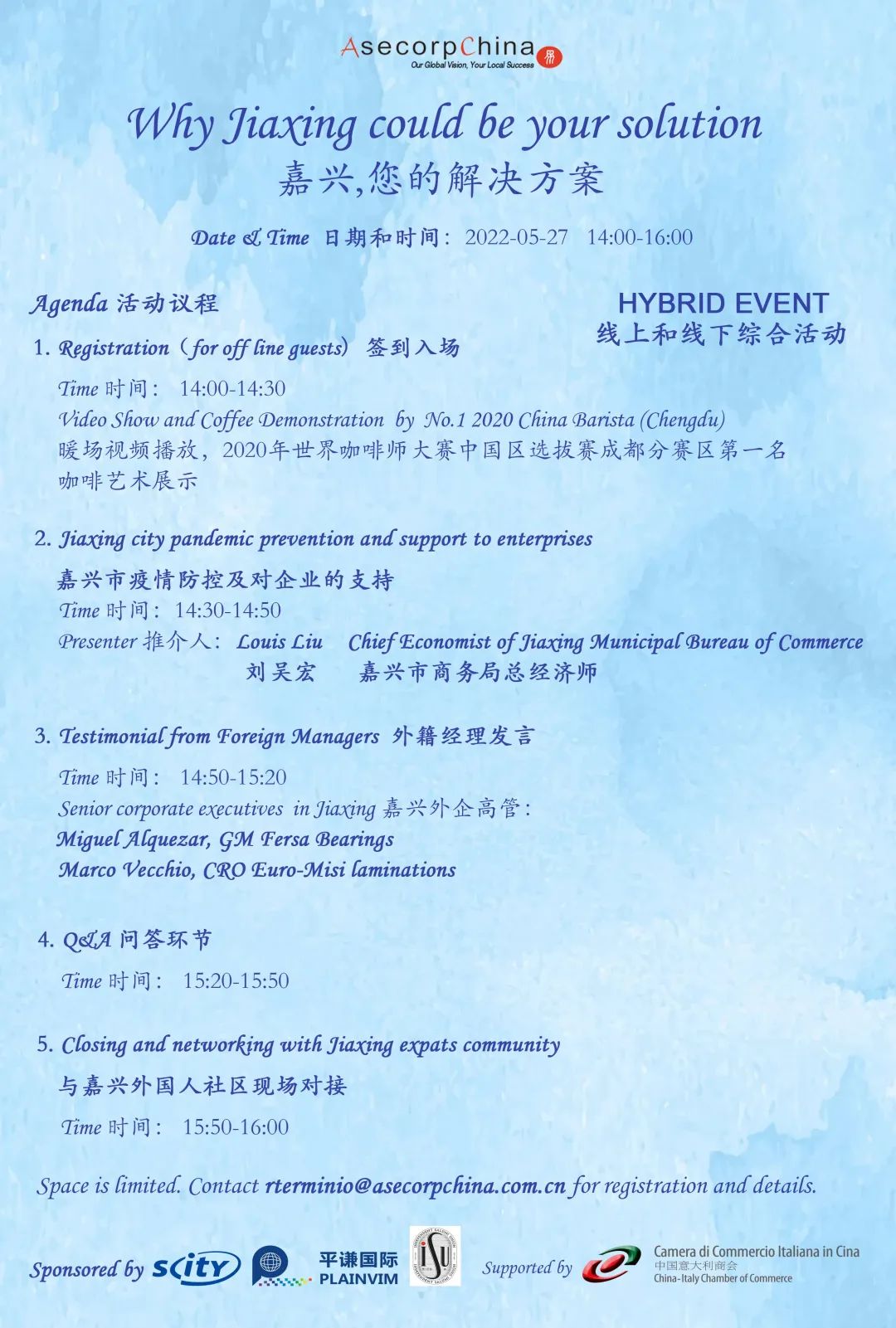 Our Member AsecorpChina Business Consulting, with the support of the China-Italy Chamber of Commerce, is pleased to invite you to the hybrid event “Why Jiaxing could be your solution”, which will take place on May 27th, 2022 (2:00 pm - 4:00 pm) both online and offline in Jiaxing.