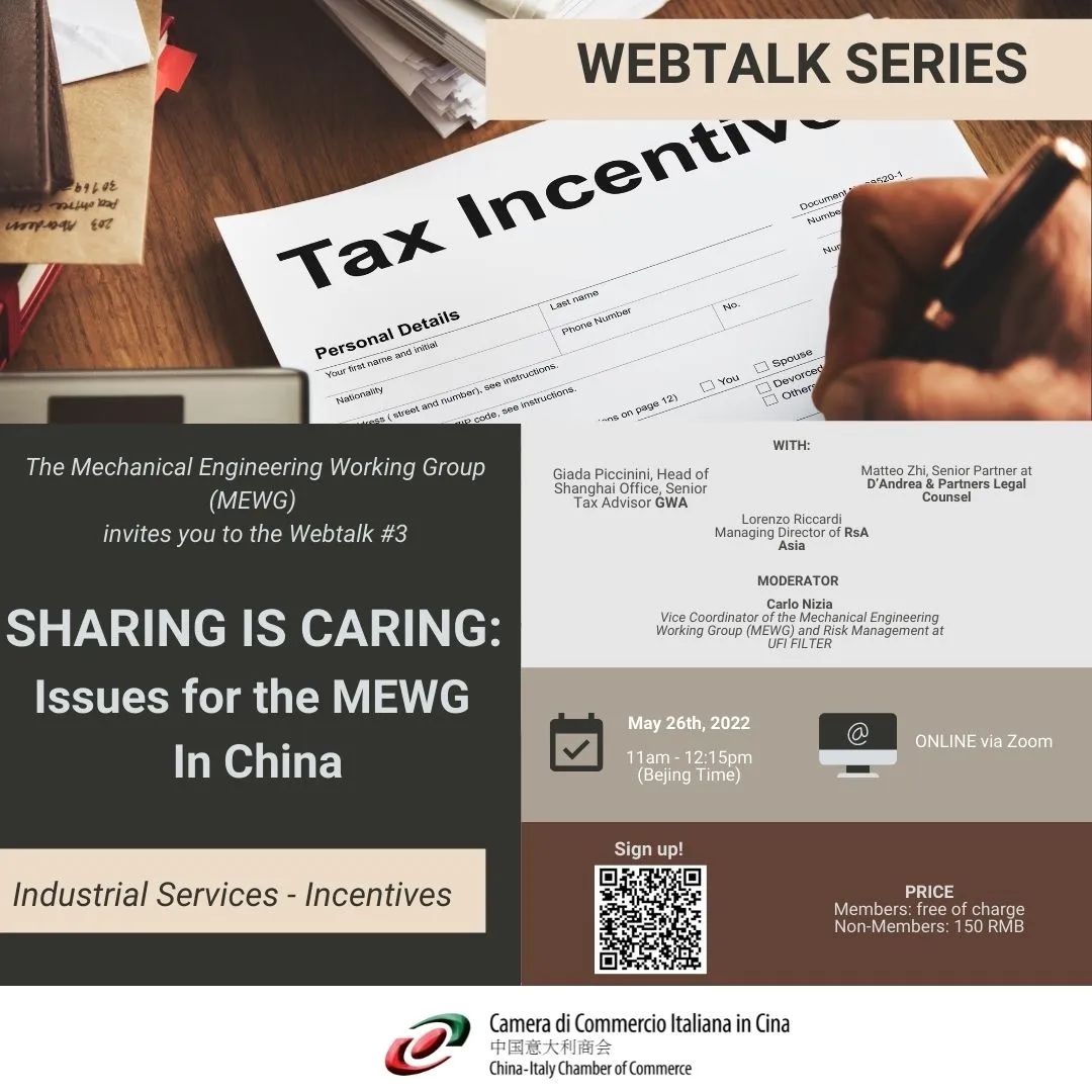 The third webtalk of "Sharing Is Caring: Issues for the MEWG in China" will take place on May 26th, 2022 at 11:00 AM (Beijing time). "Sharing Is Caring" is the new webinar series launched by the China-Italy Chamber of Commerce (CICC) together with our Mechanical Engineering Working Group (MEWG).