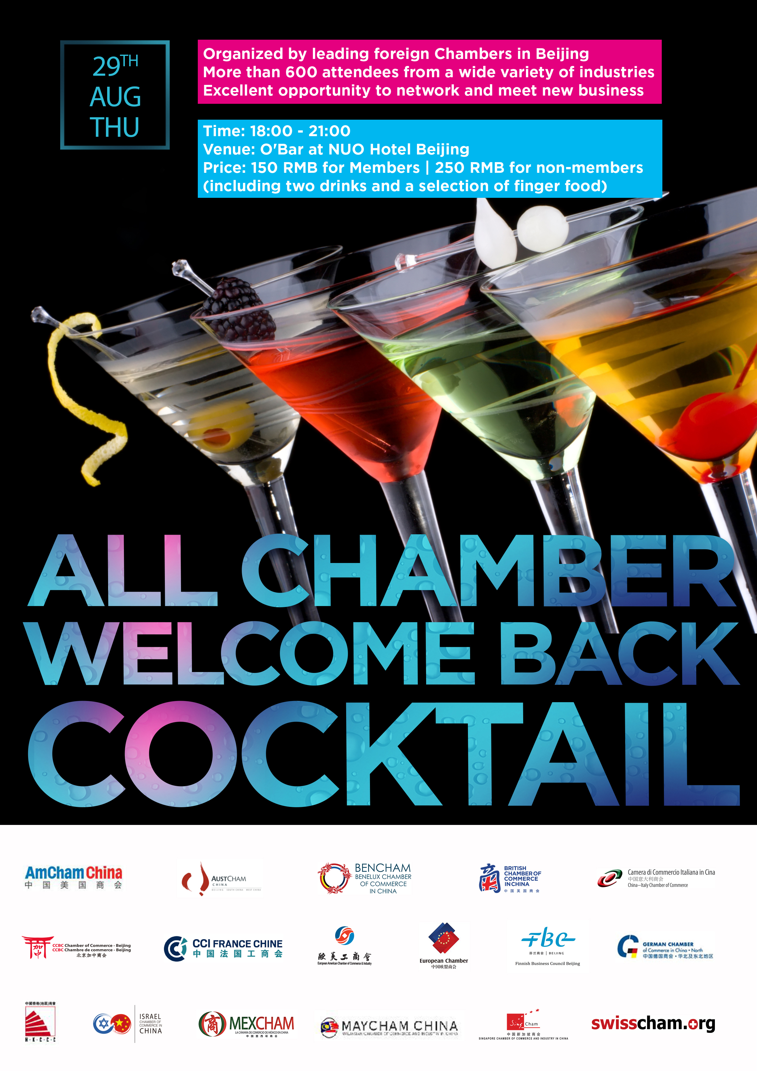 The China-Italy Chamber of Commerce, in cooperation with 16 other leading foreign Chambers in Beijing, is glad to invite you to our traditional All Chamber Welcome Back Networking, that will be held at NUO Hotel Beijing on Thursday, August 29th at 18:00pm.
