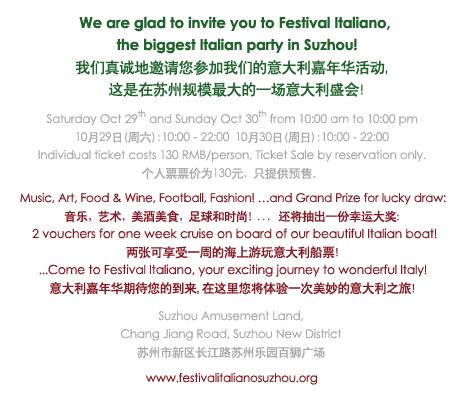 The ticket includes the entrance to the Festival Italiano area and to the whole Suzhou Amusement Land. Tickets are available at the following locations: