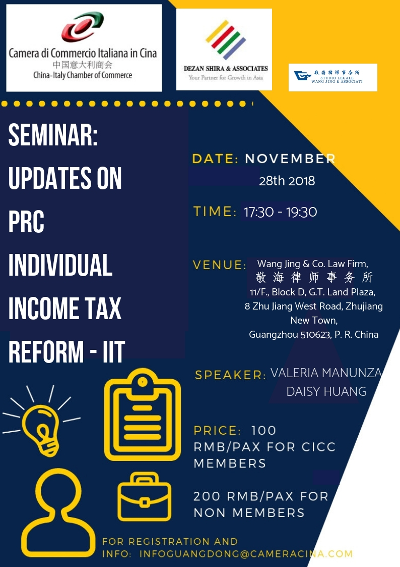 The China-Italy Chamber of Commerce invites you to take part to the Seminar "Updates on PRC individual income tax reform IIT" to be held in Guangzhou on November 28th, 2018.