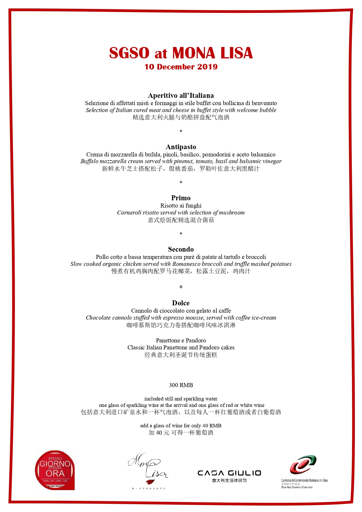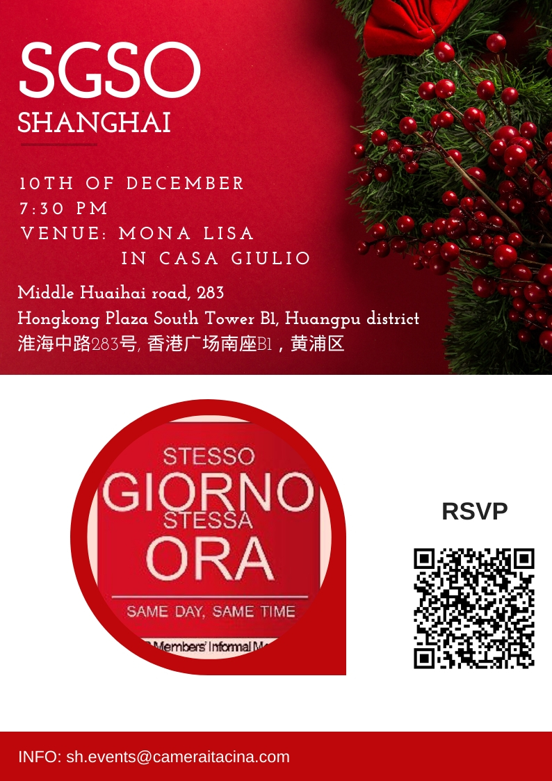 This month, the SGSO - Christmas Edition will take place on Tuesday, 10th of December at Mona Lisa in Casa Giulio, Shanghai, starting from 19:30.