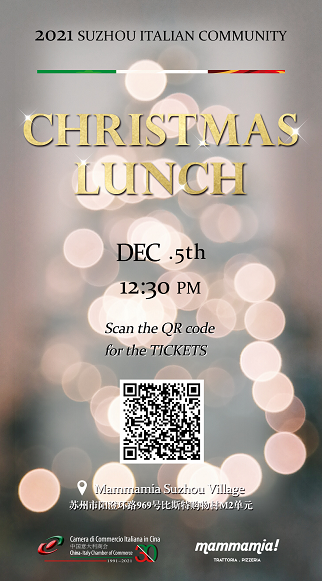 The China-Italy Chamber of Commerce is pleased to invite you to the CICC Christmas Lunch 2021 for the Italian community in Suzhou, which will be held on Sunday, December 5th at Mammamia! Suzhou Village.