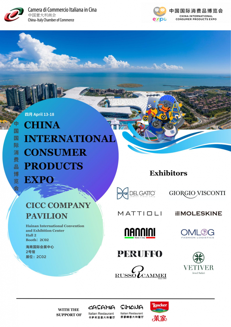 The China-Italy Chamber of Commerce (CICC) is glad to introduce the List of Exhibitors within the CICC Company Pavilion at the fourth edition of the China International Consumer Products Expo (Hainan Expo), which will be held at the Hainan International Convention and Exhibition Center in Haikou (Hainan Province) from 13th April to 18th April 2024.