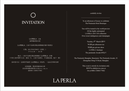 China-Italy Chamber of Commerce in Shanghai has the pleaure to annouce that La Perla opens its first boutique in Shanghai at Peninsula on March 8th, 2011, the event kicks off at 14:30, a fashion show of the latest collection and cocktail to be enjoy, the members of Italy Chamber of Commerce are welcome to join, please call Chiara at 010 65900446 or 13716818114 for invitation.
