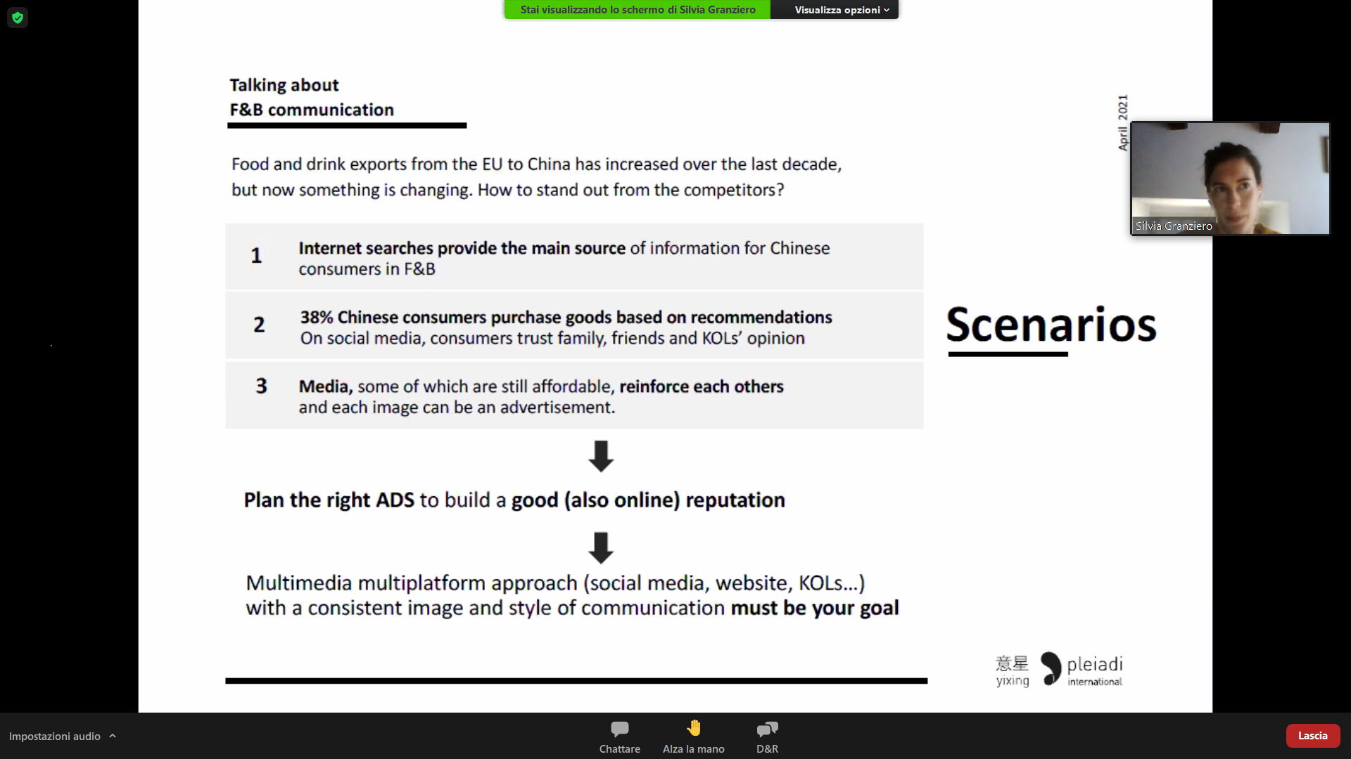 The first part of the seminar was dedicated to “I’M ON THE MARKET, how to promote my product? Tools and strategies for the ADV on the Chinese market”, organized by Pleiadi International. This webinar had as a focal point the Italian F&B companies within the F&B Chinese market.