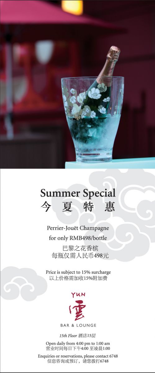 Celebrate the Summer at the Yun Bar & Lounge at the Peninsula (15th floor) with Perrier-Jouet Champagne for only RMB 498/bottle!