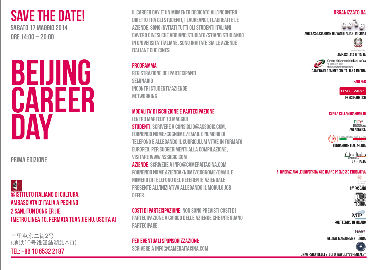La prima edizione del Beijing Career Day si svolge Sabato 17 Maggio 2014 presso l’Istituto Italiano di Cultura, Ambasciata d’Italia a Beijing.