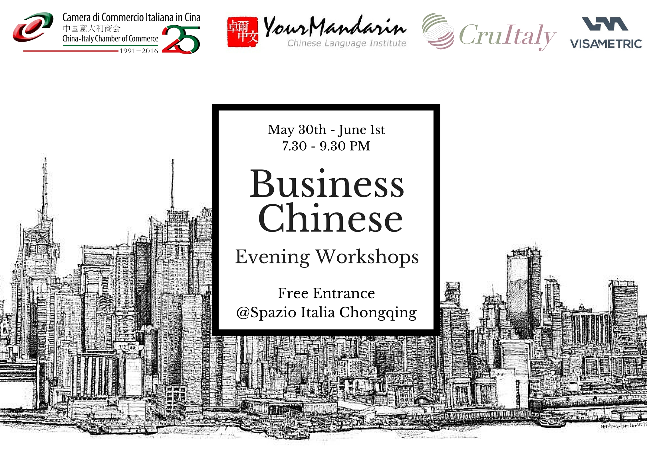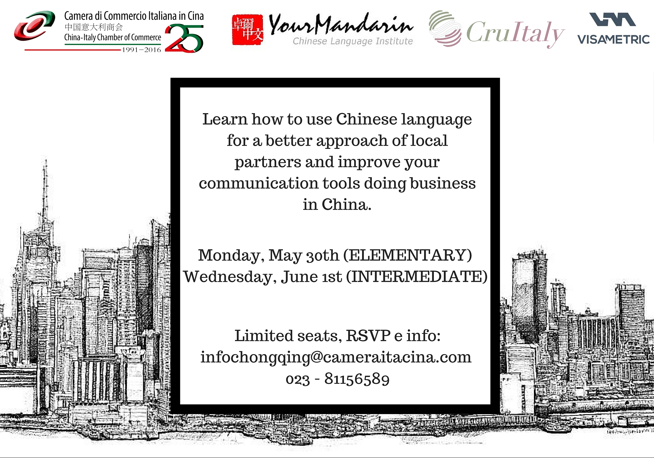 The event, free of charge, organized in collaboration with YourMandarin Chinese Language Institute, will be held on May 30th and June 1st from 7:30 PM to 9:30 PM at Spazio Italia (81 Plaza 3rd floor, Bayi Road 250, Jiefangbei, Yuzhong District, Chongqing 重庆 渝中区 八一路250号 81广场第三层L305).