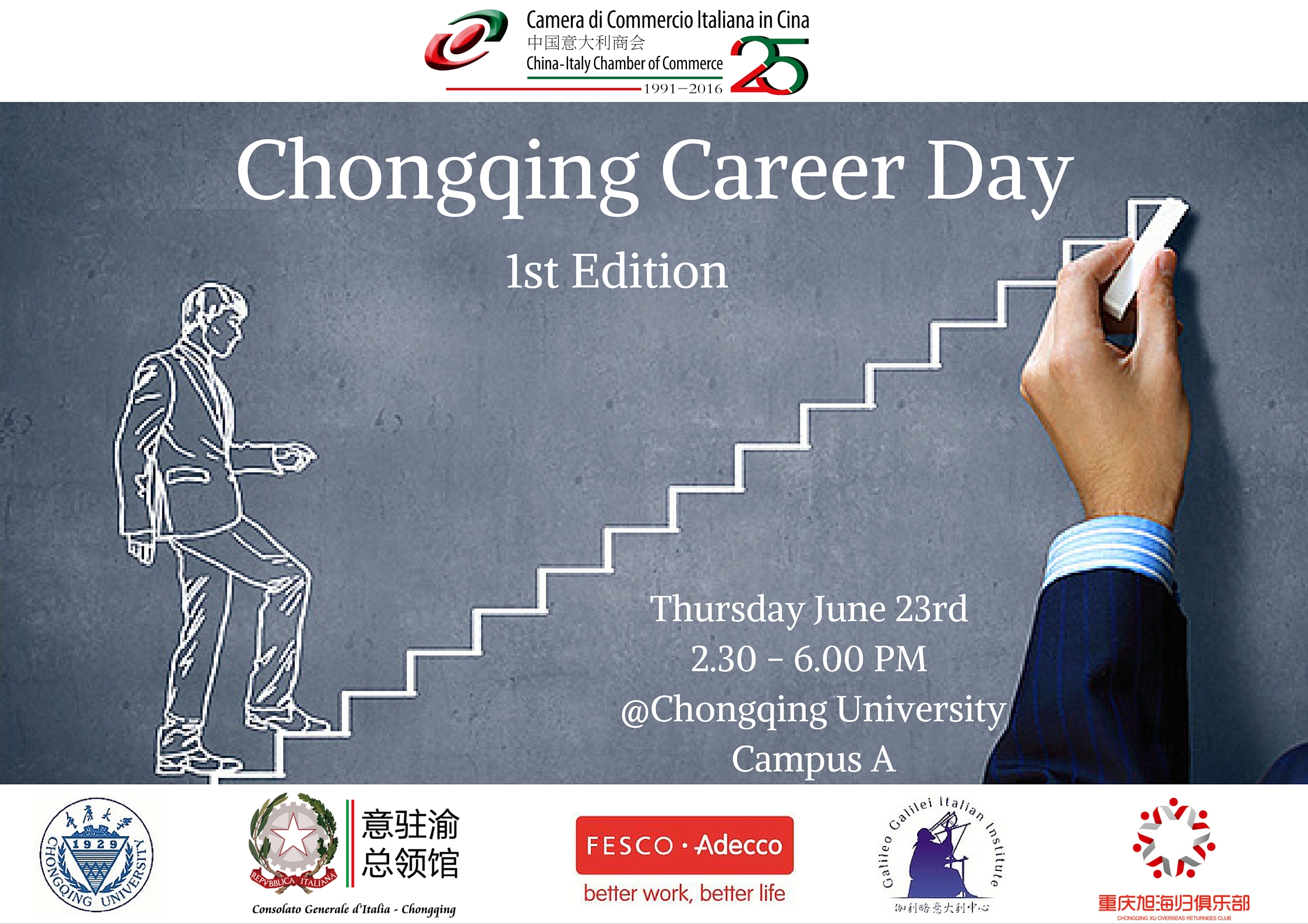 The China-Italy Chamber of Commerce, in collaboration with Chongqing University​Consulate General of Italy in ChongqingFesco Adecco, Galileo Galilei Italian Institute and Chongqing Xu Overseas Chinese Returnees Club, organizes the 1st Chongqing Career Day on Thursday June 23rd from 2:30 PM to 6:00 PM at Chongqing University, Campus A, International Conference Hall, Room 306, 174 Shazheng Street, Shapingba, Chongqing ( 重庆大学A区国际会议厅306, 沙正街,174号 沙坪坝区,重庆大学).