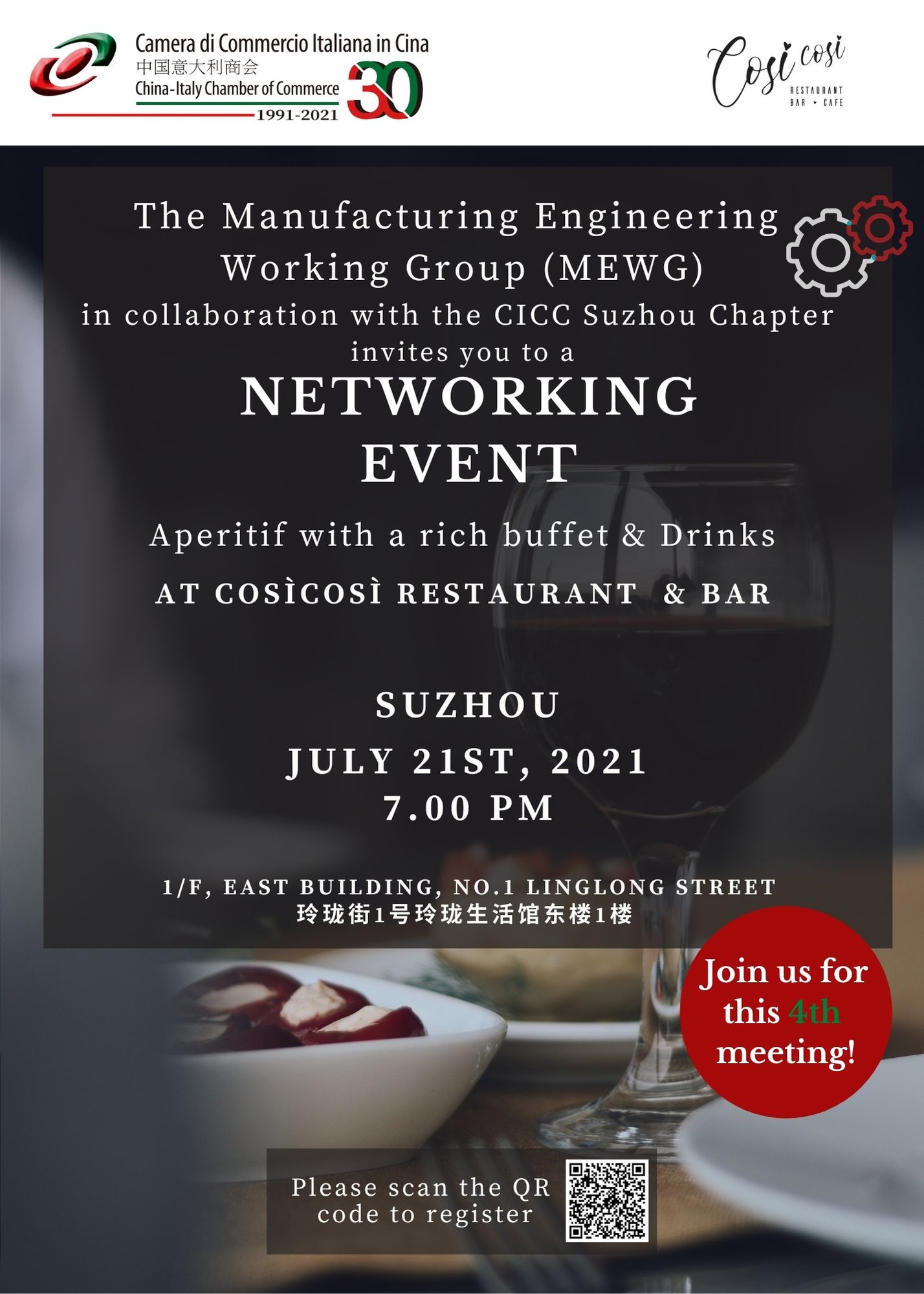 The Manufacturing Engineering Working Group (MEWG) of the China-Italy Chamber of Commerce (CICC) together with the CICC Suzhou Chapter kindly invites you to take part in the 4th Edition of CICC MEWG Business Networking Event.