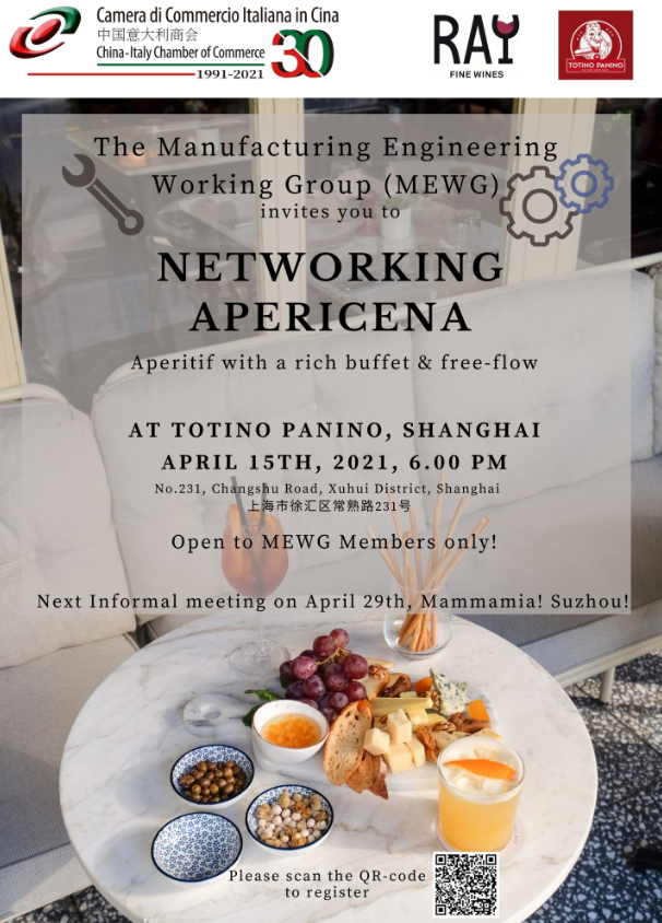 The Manufacturing Engineering Working Group (MEWG) of the China-Italy Chamber of Commerce (CICC) kindly invites you to take part at the 1st Edition of CICC MEWG Networking Apericena.