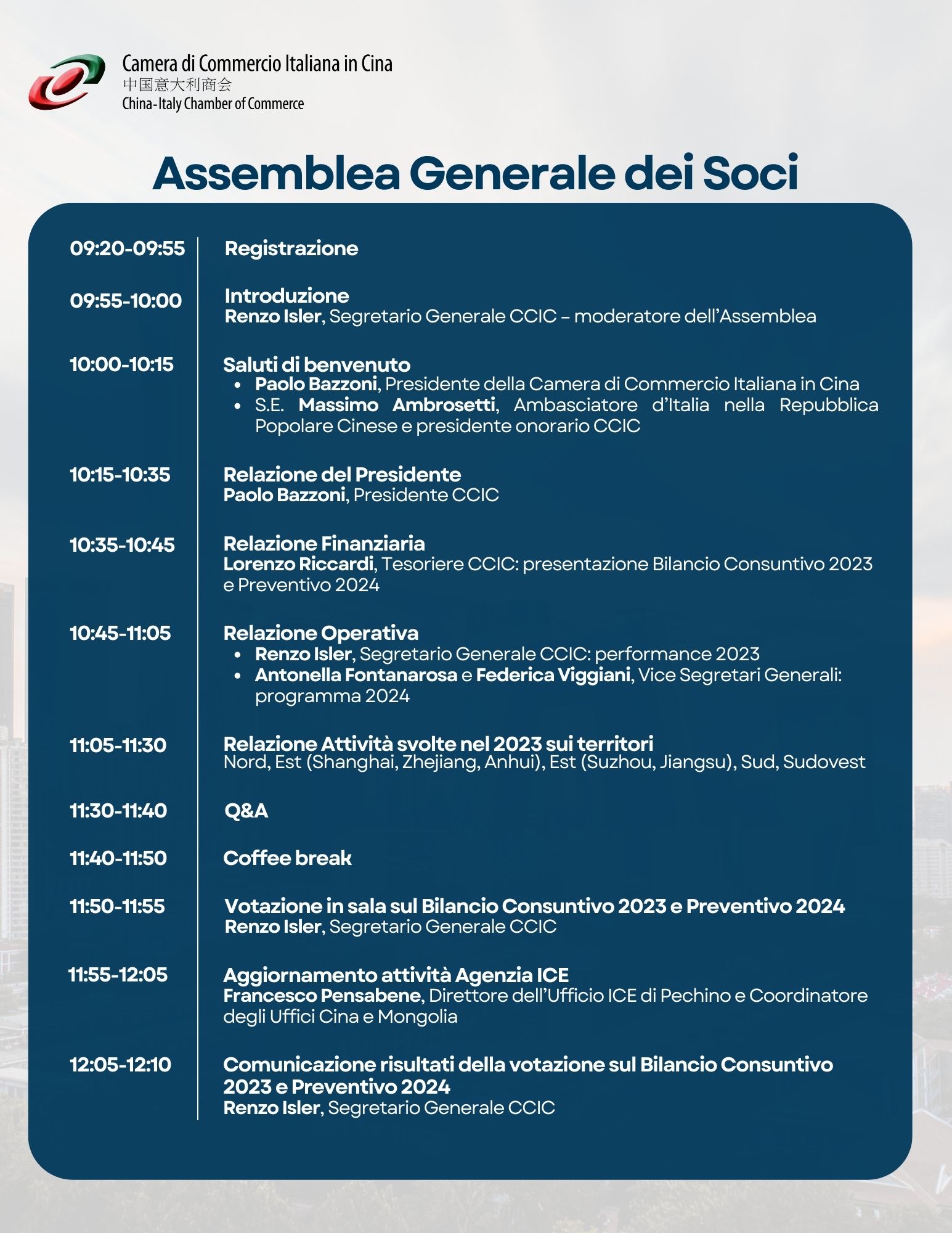 La Camera di Commercio Italiana in Cina (CCIC) è lieta di informarvi che, come previsto dall’art. 11 dello Statuto camerale, viene convocata per il giorno 27 marzo 2024 l’Assemblea Generale della CCIC.