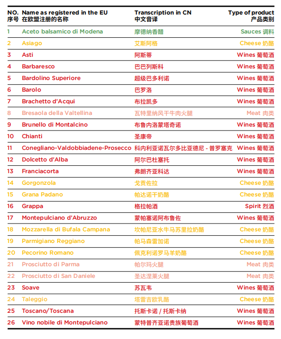 悠久历史、多样的地理环境和丰富多彩的文化造就了意大利独特、有趣、丰富的美食和葡萄佳酿。《2020中欧地理标志保护协议》于2021年3月正式生效,该项双边协议确定了200多个欧盟和中国食品在对方领土上受到保护,免受侵权和仿冒的危害。其中,意大利多达26种产品类别,包括葡萄酒、奶酪、火腿、腌肉和香醋等,入围这份协议,被认证为正宗的意大利“受保护的地理标志”产品。