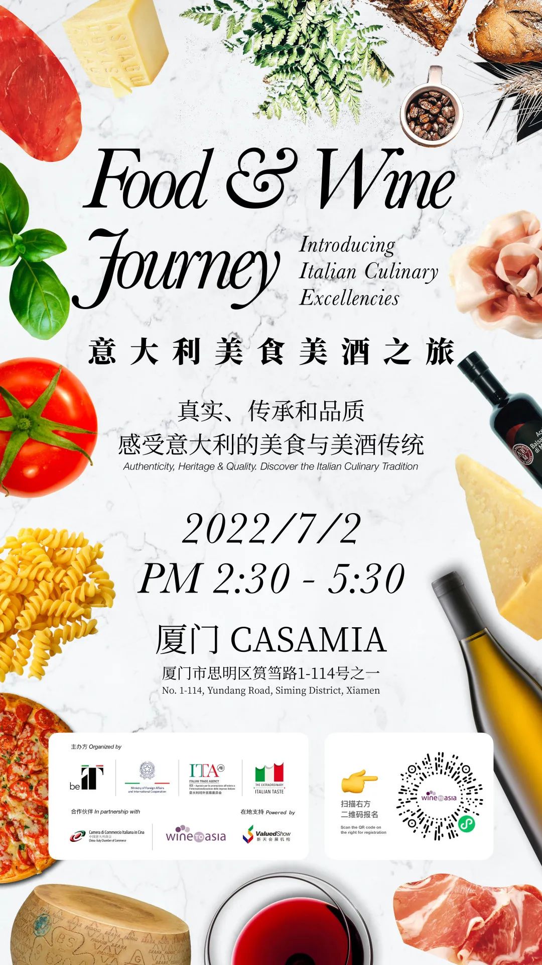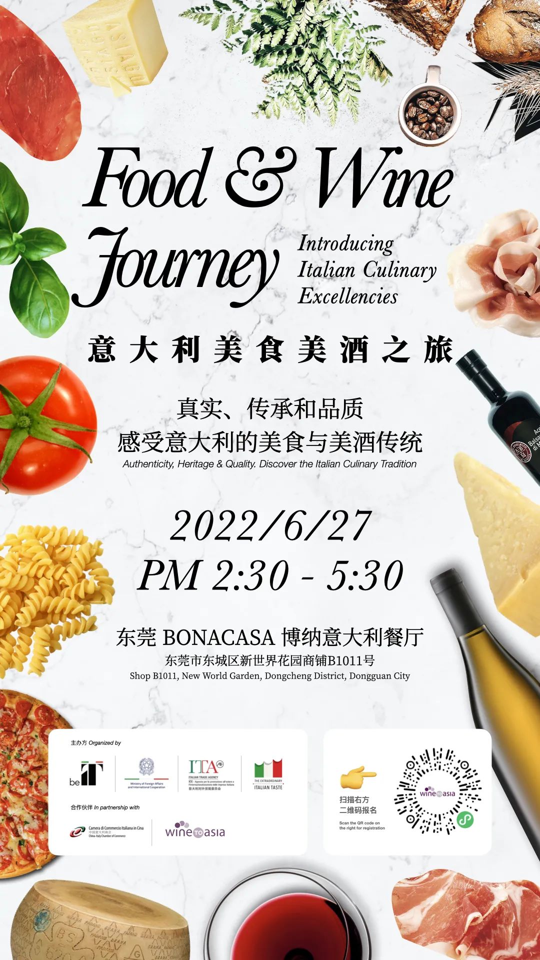 由Italian Trade Agency Canton Office意大利对外贸易委员会广州代表处主办,Wine to Asia、China-Italy Chamber of Commerce中国意大利商会合作协办的“意大利美食美酒之旅(Food & Wine Journey: Introducing Italian Culinary Excellencies)”将于6月24、27、29、30日、7月2日在广州、东莞、深圳、长沙、厦门五城拉开帷幕,旨在向中国市场展现来自意大利的26种高品质PGI(受中欧地理标志保护)产品,帮助食品、酒水领域的专业人士和消费者更全面地了解地道意大利美食、美酒,促进意大利PGI产品在中国市场的认知度。