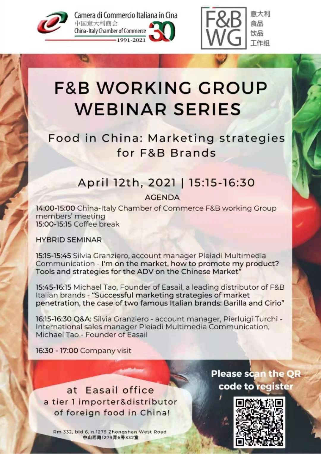 The Food & Beverage Working Group of the China-Italy Chamber of Commerce is glad to invite you to join the Hybrid Seminar entitled “Food in China: Marketing strategies for F&B Brands”, which will take place on April 12th, 2021, from 15:15 till 16:30 (Beijing time),  both online and offline at the Easail office, in Shanghai (Rm 332, bld 6, n.1279 Zhongshan West Road, 中山西路1279弄6号332室).