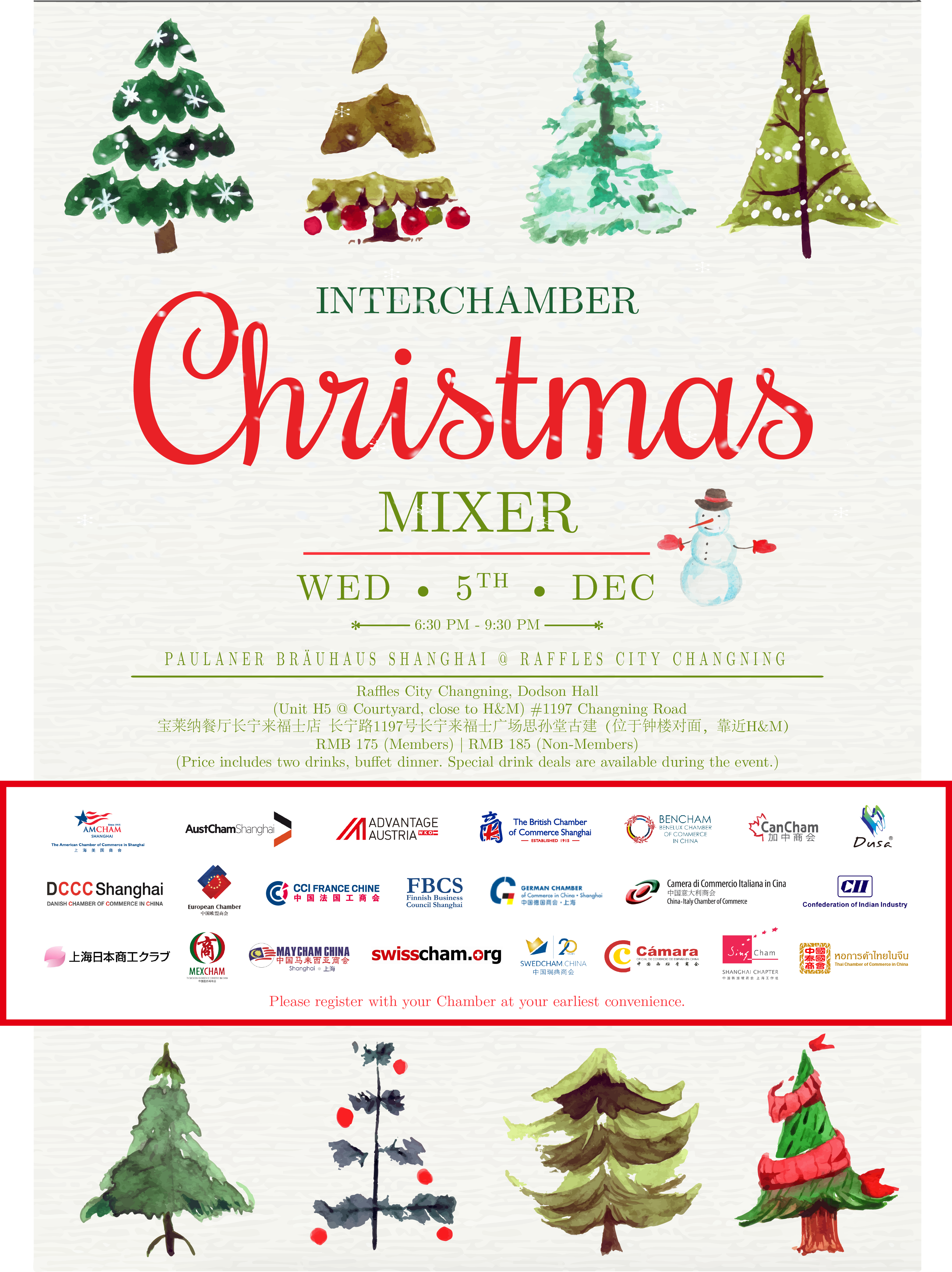 Join all the Chambers and bring your friends and colleagues to celebrate this multinational Christmas cocktail with the Shanghai community.
