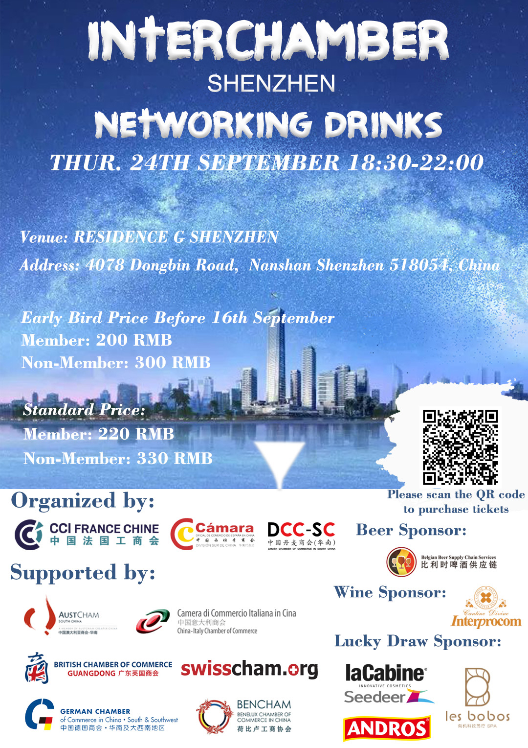 The China-Italy Chamber of Commerce (CICC), in cooperation with the British Chamber of Commerce Guangdong, the Australian Chamber of Commerce-South China, the Benelux Chamber of Commerce in China, the French Chamber of Commerce and Industry in China, the German Chamber of Commerce-South and Southwest China, the Swiss Chinese Chamber of Commerce in China, the Danish Chamber of Commerce in South China and the Spanish Chamber of Commerce in China, is glad to invite you to the Interchamber Business Networking which will be held in Shenzhen on September 24th, at the Residence G.