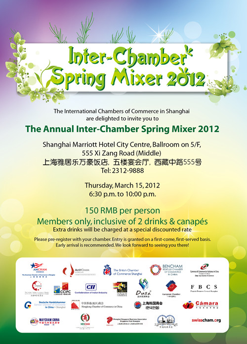 China-Italy Chamber of Commerce, together with participating foreign Chambers of Commerce in Shanghai, has the pleasure to invite our members to attend the InterChamber Spring Mixer 2012, which will be held in Shanghai Marriott Hotel City Centre on March 15th, 2012.