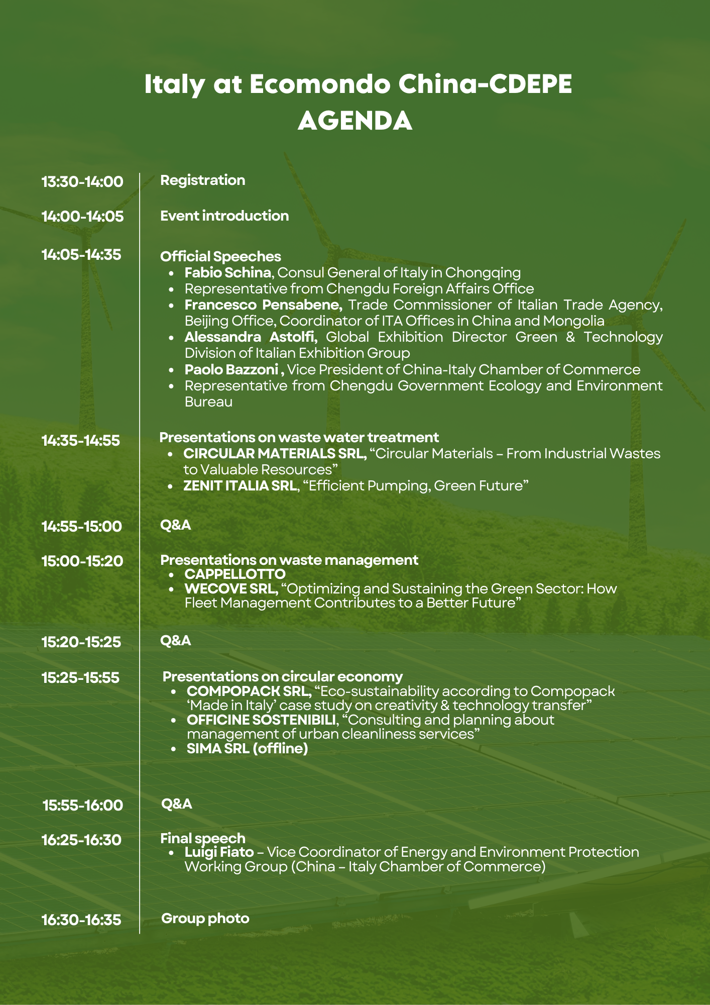 Under the framework of the 8th Sustainable Development Festival and the Chengdu-Europe Industrial Dialogue, the italian companies will elaborate on the theme of sustainable development in the environmental protection industry.