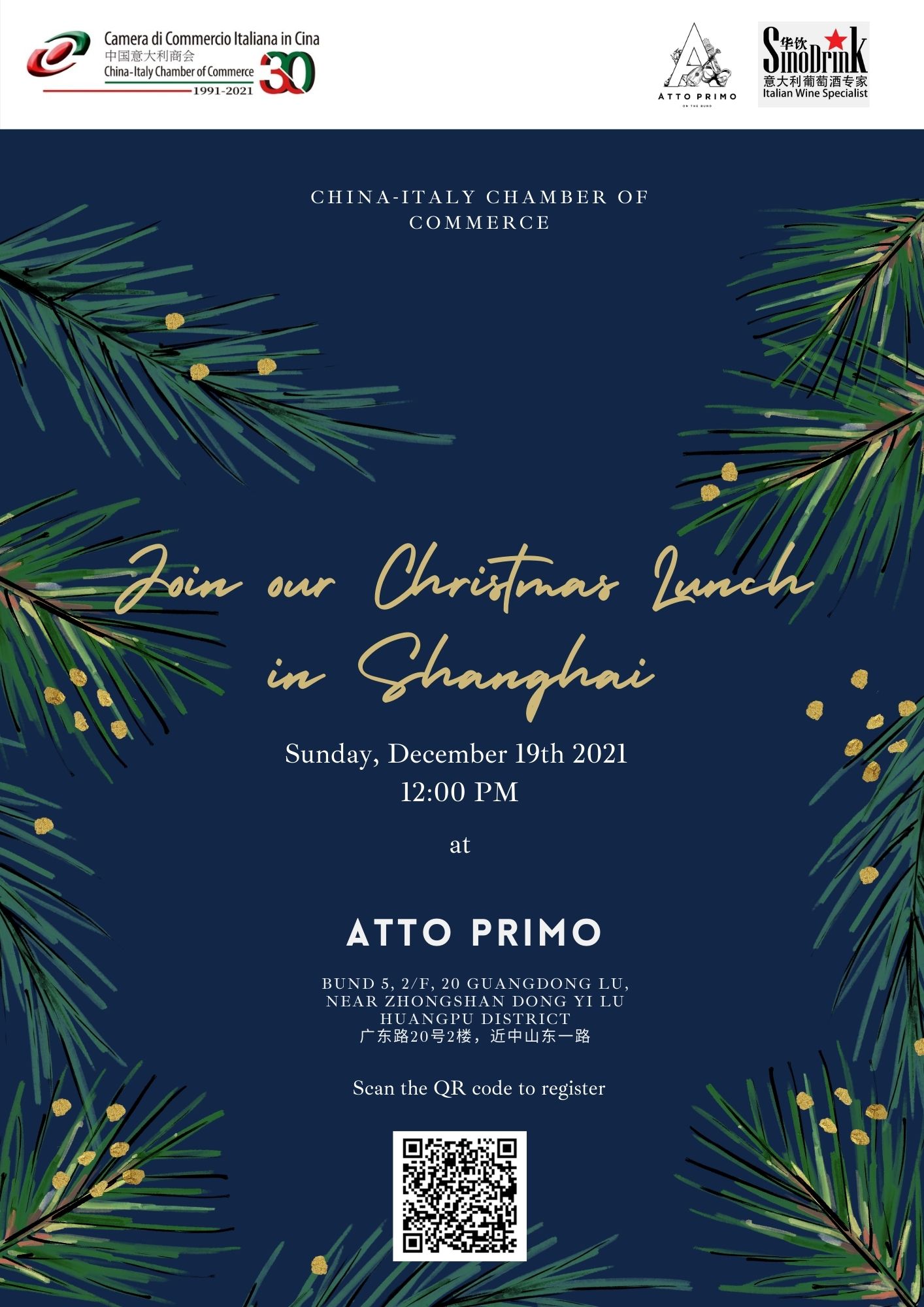 The China-Italy Chamber of Commerce (CICC) is pleased to invite you to our Christmas Lunch in Shanghai, which will be held on Sunday, December 19th at ATTO PRIMO (Bund 5, 2/F, 20 Guangdong Lu, near Zhongshan Dong Yi Lu Huangpu District / 广东路20号2楼,近中山东一路). Registration starts at 12:00 PM.