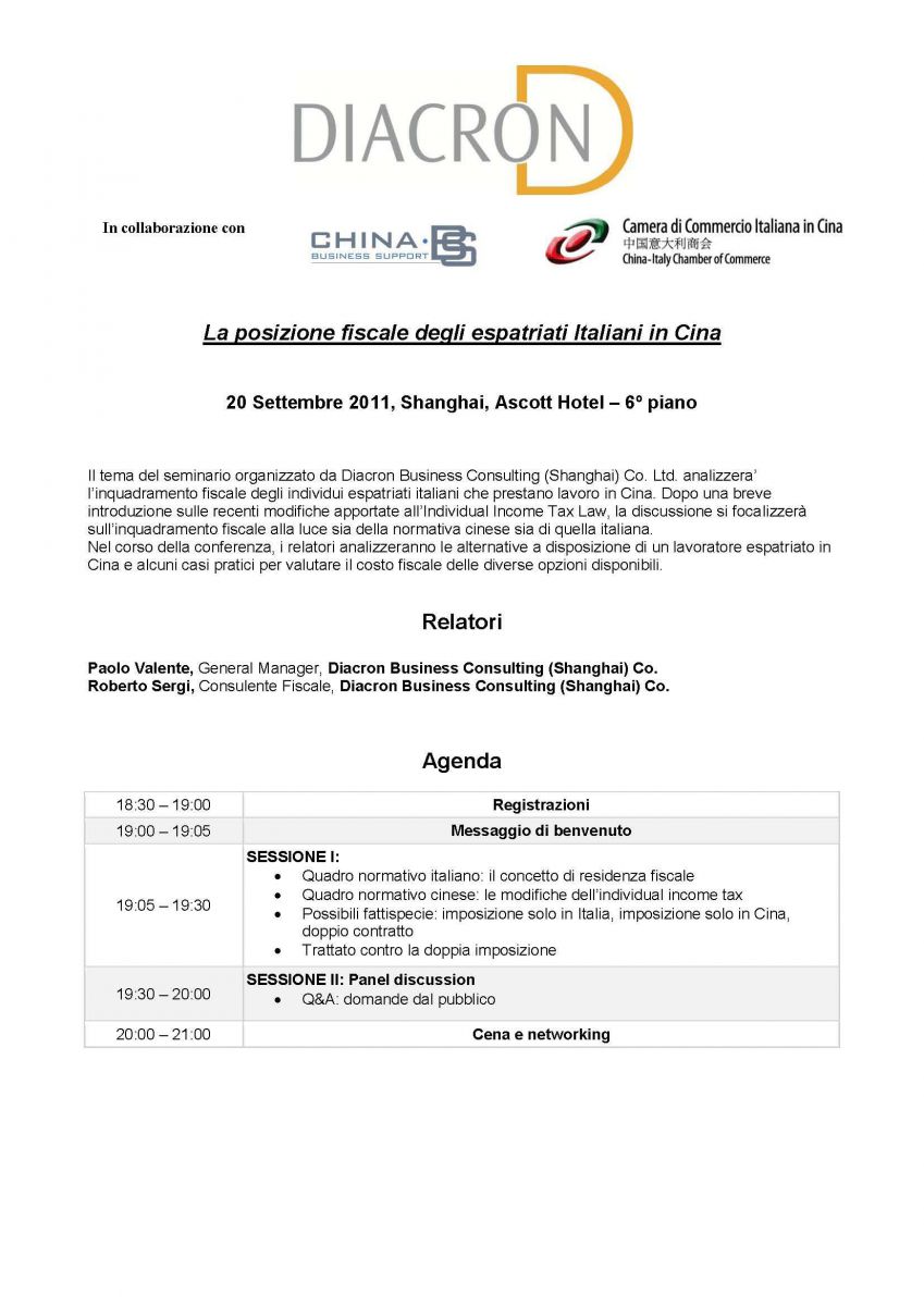 La Camera di Commercio Italiana in Cina, in collaborazione con Diacron Business Consulting (Shanghai) Co., Ltd. e China Business Support., è lieta di invitarvi al seminario “La posizione fiscale degli espatriati italiani in Cina” che si terra’ il 20 settembre 2011 a Shanghai, presso l’Ascott Hotel. Il seminario si terra’ in lingua italiana.