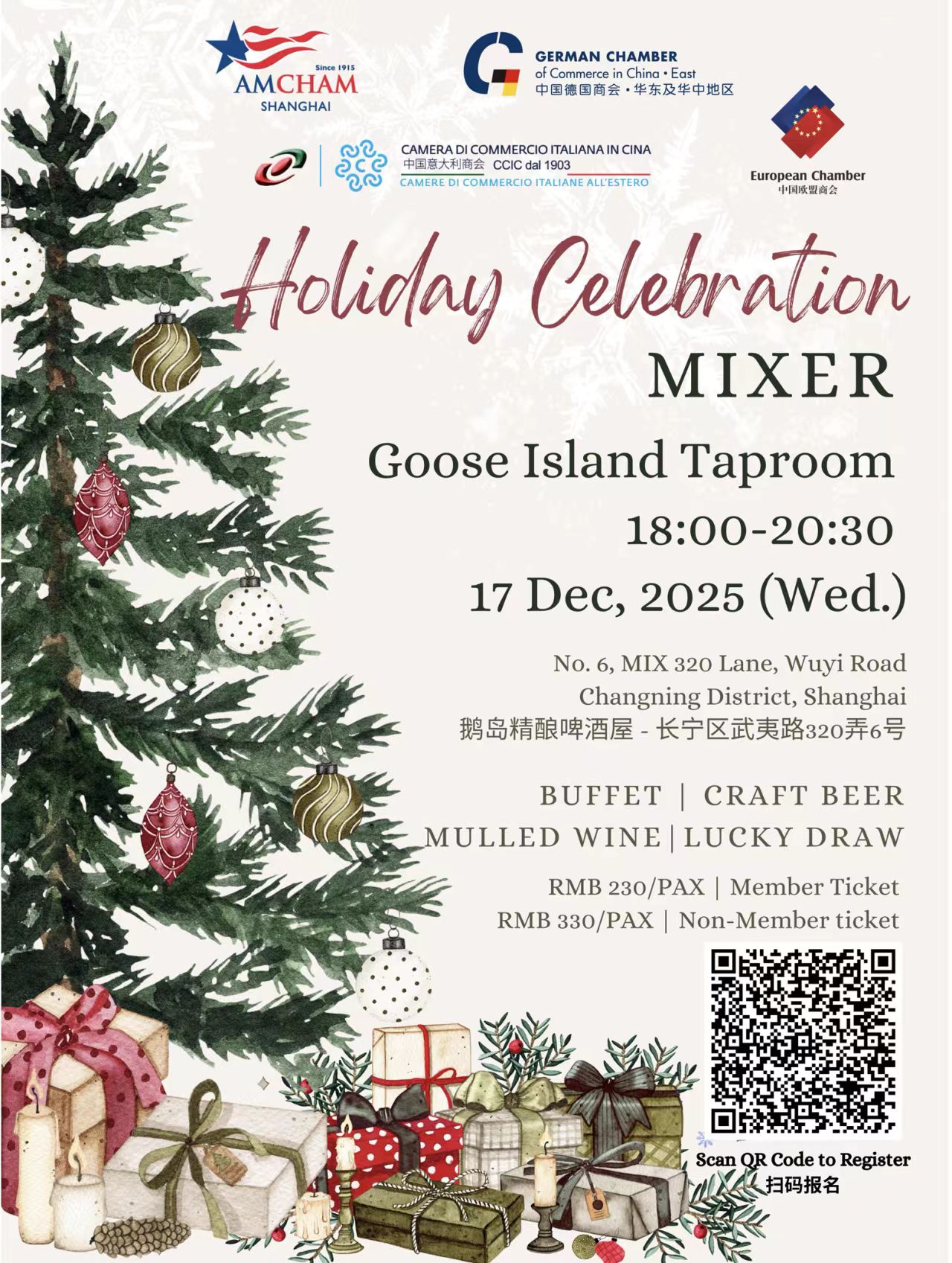 The China-Italy Chamber of Commerce (CICC) invites you to register for the Interchamber Holiday Celebration Mixer, jointly hosted alongside the American Chamber, the German Chamber, and the European Chamber of Commerce. The event will take place on Wednesday, December 17th, 2025, from 18:00 to 20:30 at Goose Island Taproom, Changning District, Shanghai.