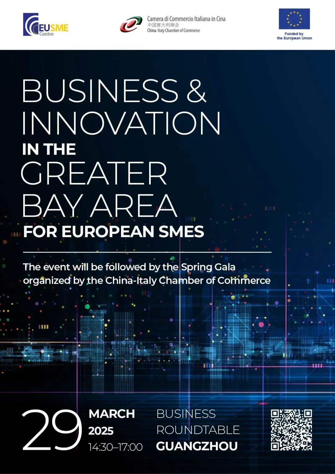 The China-Italy Chamber of Commerce (CICC), together with the EU SME Centre, is pleased to invite you to the Roundtable on “Business & Innovation in the Greater Bay Area for European SMEs”, taking place on March 29, 2025, at the Four Seasons Hotel in Guangzhou, from 14:30 to 17:00 (China time).