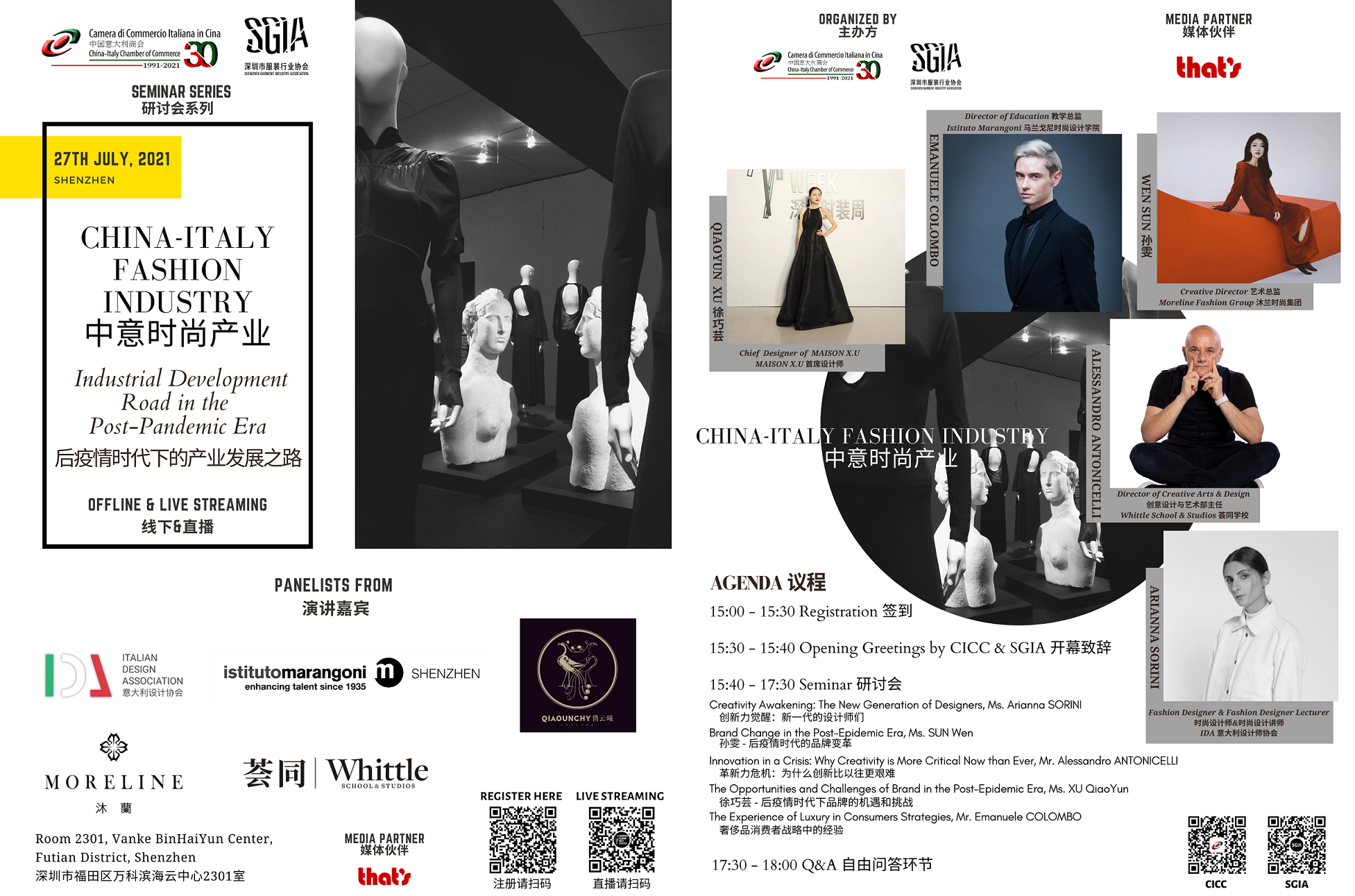 The China-Italy Chamber of Commerce (CICC) is glad to invite you to the hybrid Seminar: "China-Italy Fashion Industry - Industrial Development Road in the Post-Pandemic Era", which will be held offline and in live streaming on July 27th, 2021, from 3.30 pm to 6 pm (China Standard Time).