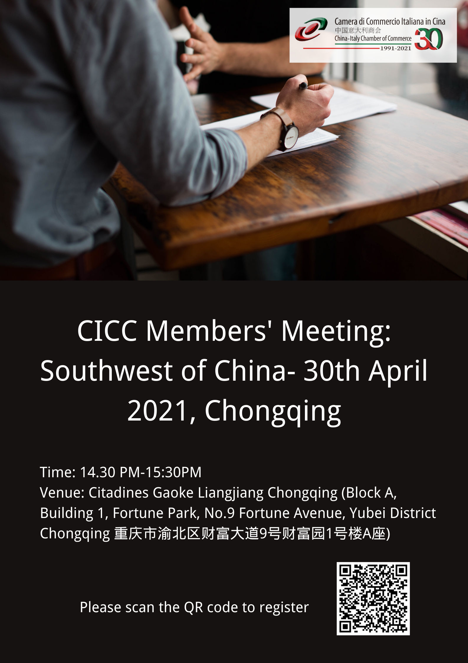 The China-Italy Chamber of Commerce (CICC) is pleased to invite you to the CICC Members' Meeting: Southwest of China that will be held at 2.30 PM on Friday 30th April 2021 at Chongqing Citadines Gaoke Liangjiang Chongqing (Block A, Building 1, Fortune Park, No.9 Fortune Avenue, Yubei District Chongqing).