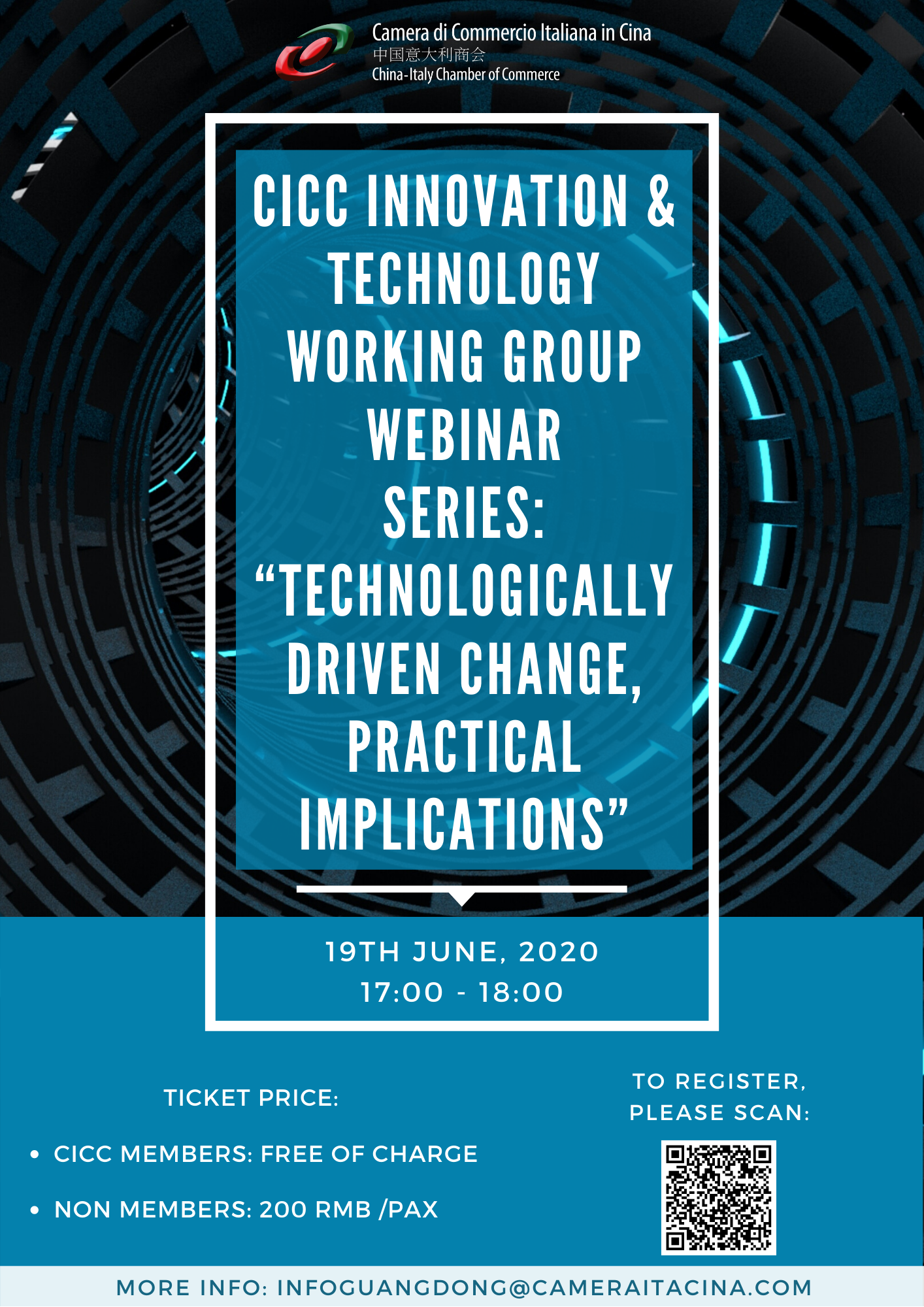 The China-Italy Chamber of Commerce invites you to take part to the Webinar organized by CICC Innovation & Technology Working group, which is the first of a monthly series: “Technologically driven change, practical implications” to be held online on Friday June 19th from 17:00-18:00 (Beijing Time).