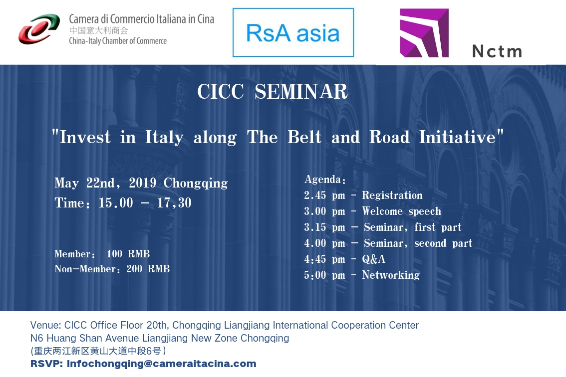 The China-Italy Chamber of Commerce is pleased to invite you to the Seminar "Invest in Italy along The Belt Road Initiative” that will take place on 22nd of May 2019 at 3.00 pm - 5,30 pm in CICC Office Branch Chongqing .