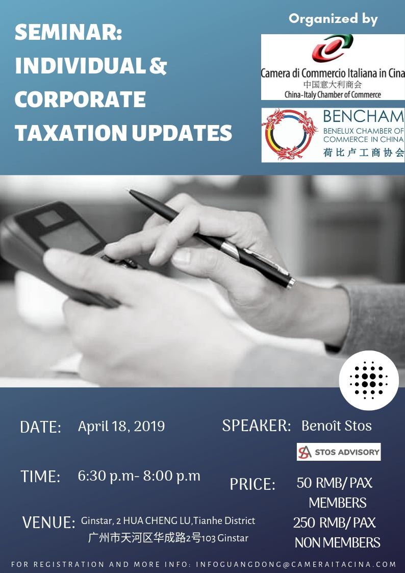 The China-Italy Chamber of Commerce invites you to take part to the Seminar “Individual & Corporate Taxation Updates” to be held in Guangzhou on Thursday April 18th, 2019 at 6:30 p.m.