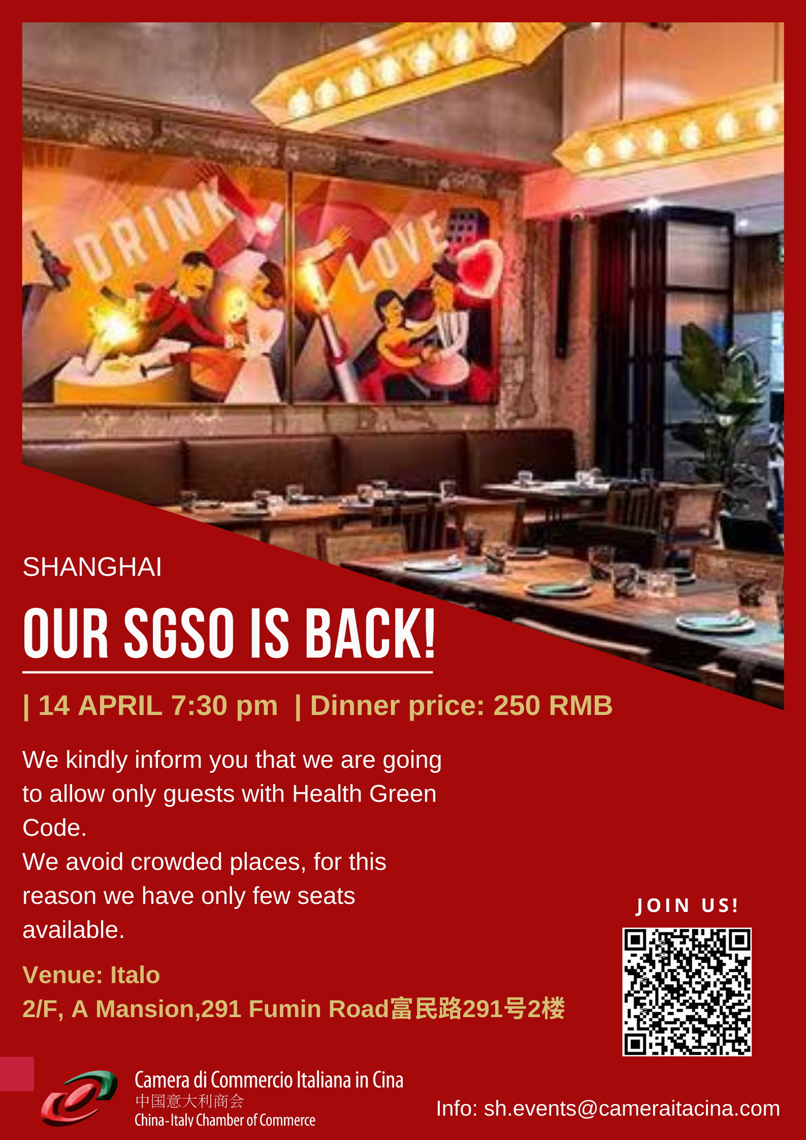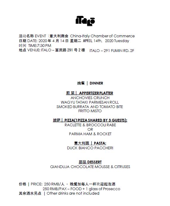 The China-Italy Chamber of Commerce (CICC) is glad to inform you that our SGSO Monthly Informal Meeting will take place on Tuesday, 14th of April at Italo starting from 7:30 pm.