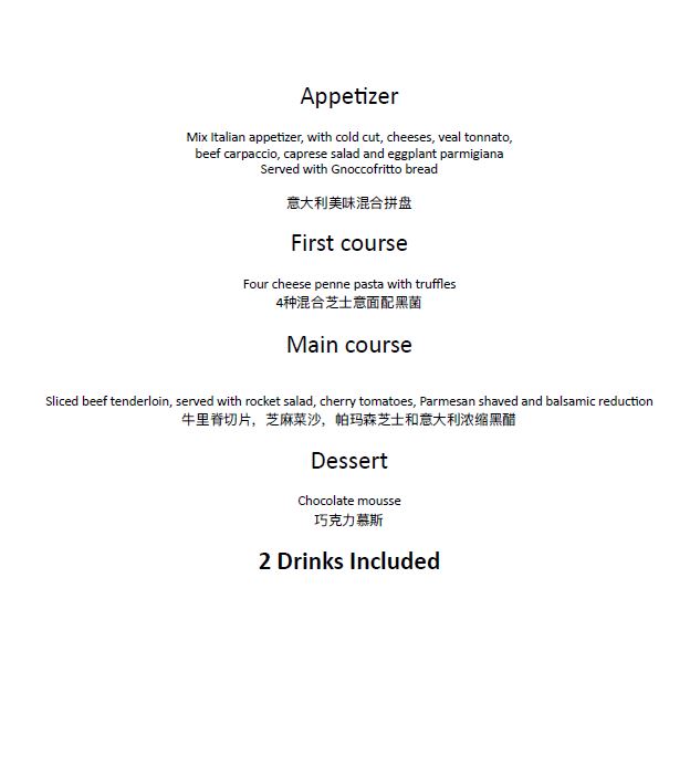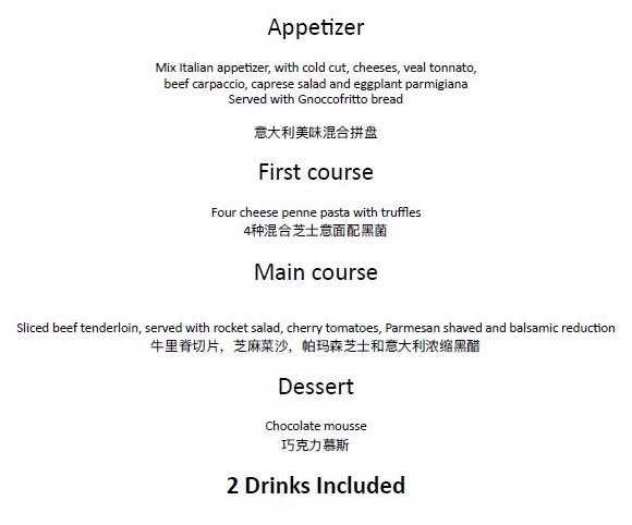 The dinner price, to be paid at the venue, is 350 RMB per person. The menu includes appetizer, first course, main course, dessert and two drinks.