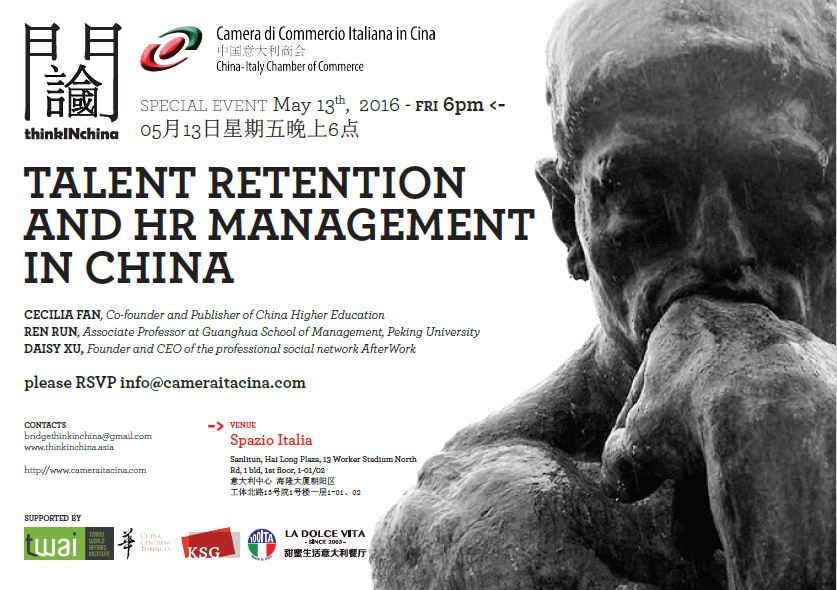 The China-Italy Chamber of Commerce (CICC) is glad to invite you to 'Talent Retention and HR Management in China', the first roundtable organized in cooperation with ThinkIN China, that will take place on May 13th, 2016 at the Spazio Italia, Beijing.
