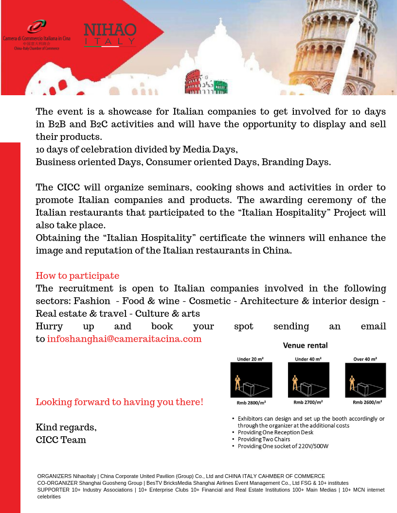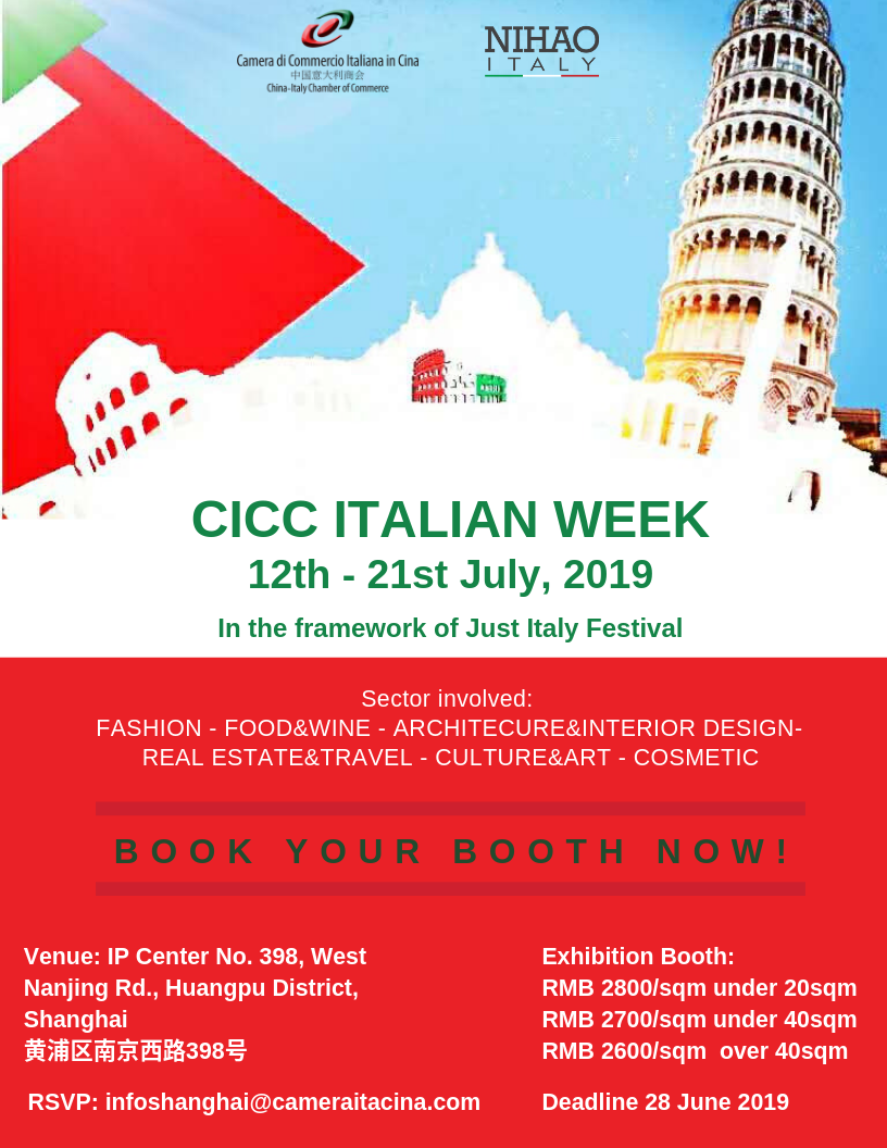The China-Italy Chamber of Commerce is glad to invite you to the “Italian Hospitality 2019 Awarding Ceremony” that will be held – in the framework of “CICC Italian Week” – the 14th of July 2019, from 10:00 to 13:00, at IP Mall, Shanghai.
