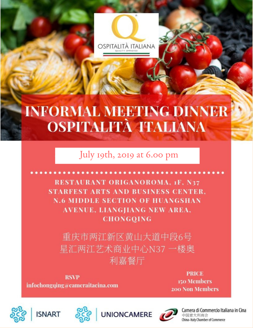 The China-Italy Chamber of Commerce kindly invites you to take part to the CICC Members' Informal Meeting for a dinner on Friday 19th of July at OriganoRoma Restaurant, starting from 6.00 pm.