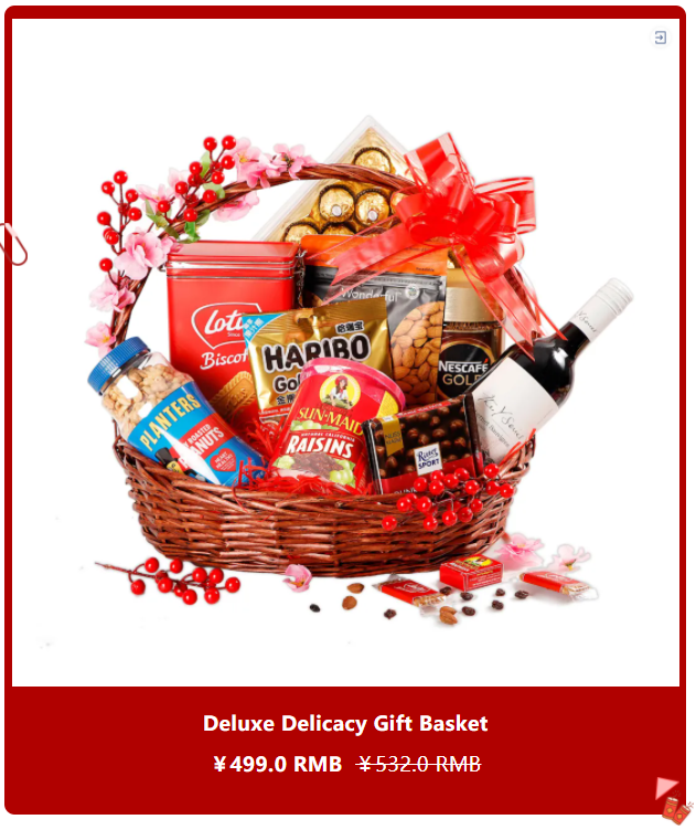 This package is an excellent assortment of premium items. The Deluxe Delicacy basket has a wide variety of different treats, such as Haribo Goldbears, Ferrero Rocher Hazelnut Chocolates, Sun-Maid Natural California Raisins, Belgium Imported Biscuits Lotus and Love Caramel Biscuits, Nescafe Gold Coffee, Wonderful Salted Almonds, Planters Dry Roasted Peanuts, Ritter Sport Yogurt Chocolate Chocolate 100g, Yalumba' Y' Series Cabernet Sauvignon.