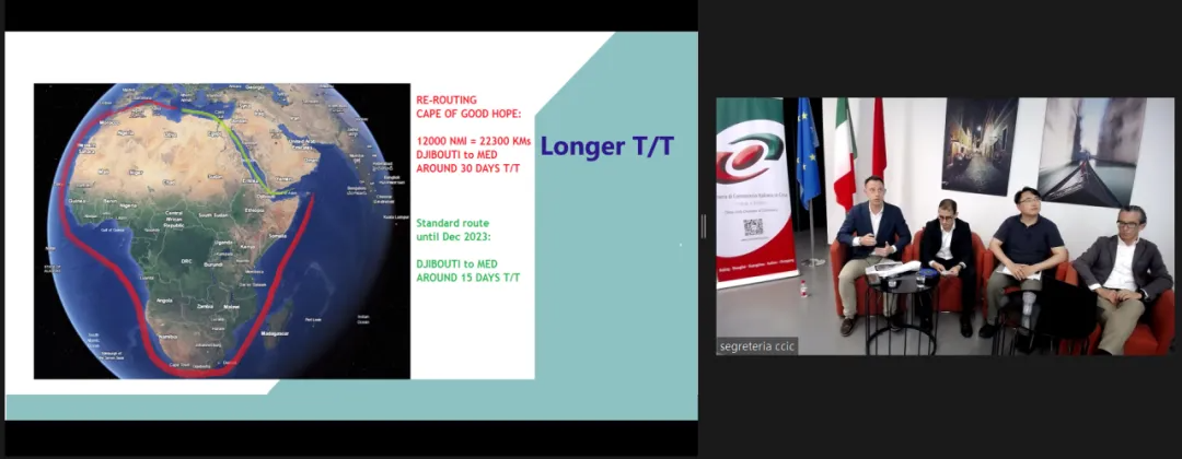 Following, moderator Danilo Sergi Alampi, General Manager at Shanghai Capital Logistic Transport Co., Ltd. Sisam Group, presented the agenda and gave the floor to the first speaker, Andrea De Sio, Office Manager of GF Logistics China Limited, who provided an overview of the sea situation with a focus on the Chinese, Italian and European market. He showed how the transit times increased following the shipping re-routing through the Cape of Good Hope and showed how the global demand is undergoing major changes as well as presenting the forecast for the following months.